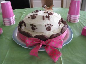 We found a photo of a similar cake after doing a google search for “dog cakes”.  It was only slightly difficult, but we loved the way it turned out!  I baked the top and bottom of the cake in two different sized pans to make the layers.  The bones around the edges were simply a chocolate sugar cookie cut with a dog bone cookie cutter.  And the paws are just a warmed chocolate icing that was piped through a medium-sized hole snipped in a baggie.  A few extra steps, but really very easy!