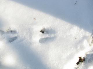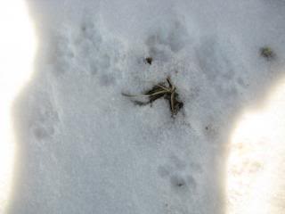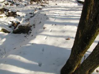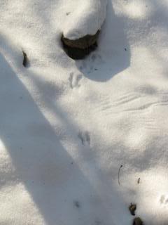 Can you see the prints all the way across the fallen tree? Maybe a raccoon, although the placement of the feet makes me think rabbit. Hmmm…