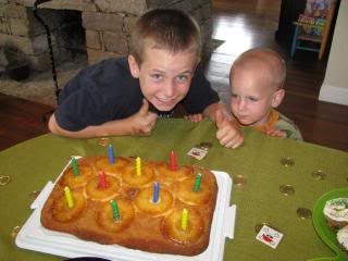 Caleb requested pineapple upside-down cake for his family party, and it just so happened that there were 10 pineapples in which to place candles. 🙂 (I had to make cupcakes for church friends AND chocolate chip cookies for his baseball team. Whew!)
