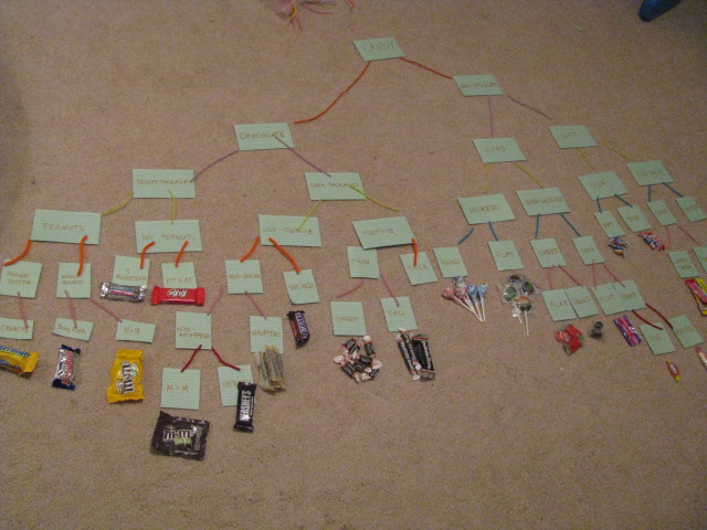 When finished, talk through each candy’s classification. An example from my son’s latest taxonomy chart: The Butterfinger’s classification would be:Â Candy; chocolate; bright wrappers; made with peanuts; made with peanut butter, crunchy; Butterfinger.