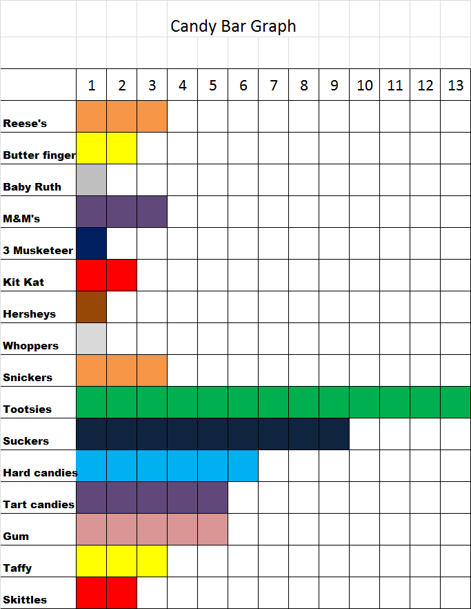 Older students could even build graphs in which one piece of candy on the graph represents two, five, or ten pieces in real life. Their labels will need to reflect this.