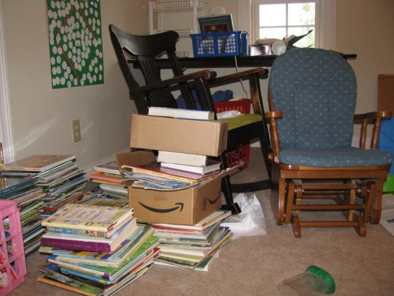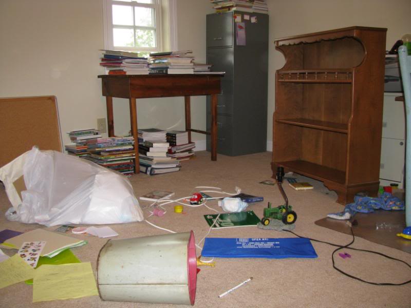 Here’s what I’ve been doing today.  Can’t tell what it is?  It’s our poor schoolroom!!  I had the urge to reorganize the whole space (again), and this is what it looked like after a couple hours’ work.  Actually, this is what it will probably look like for days!  LOL