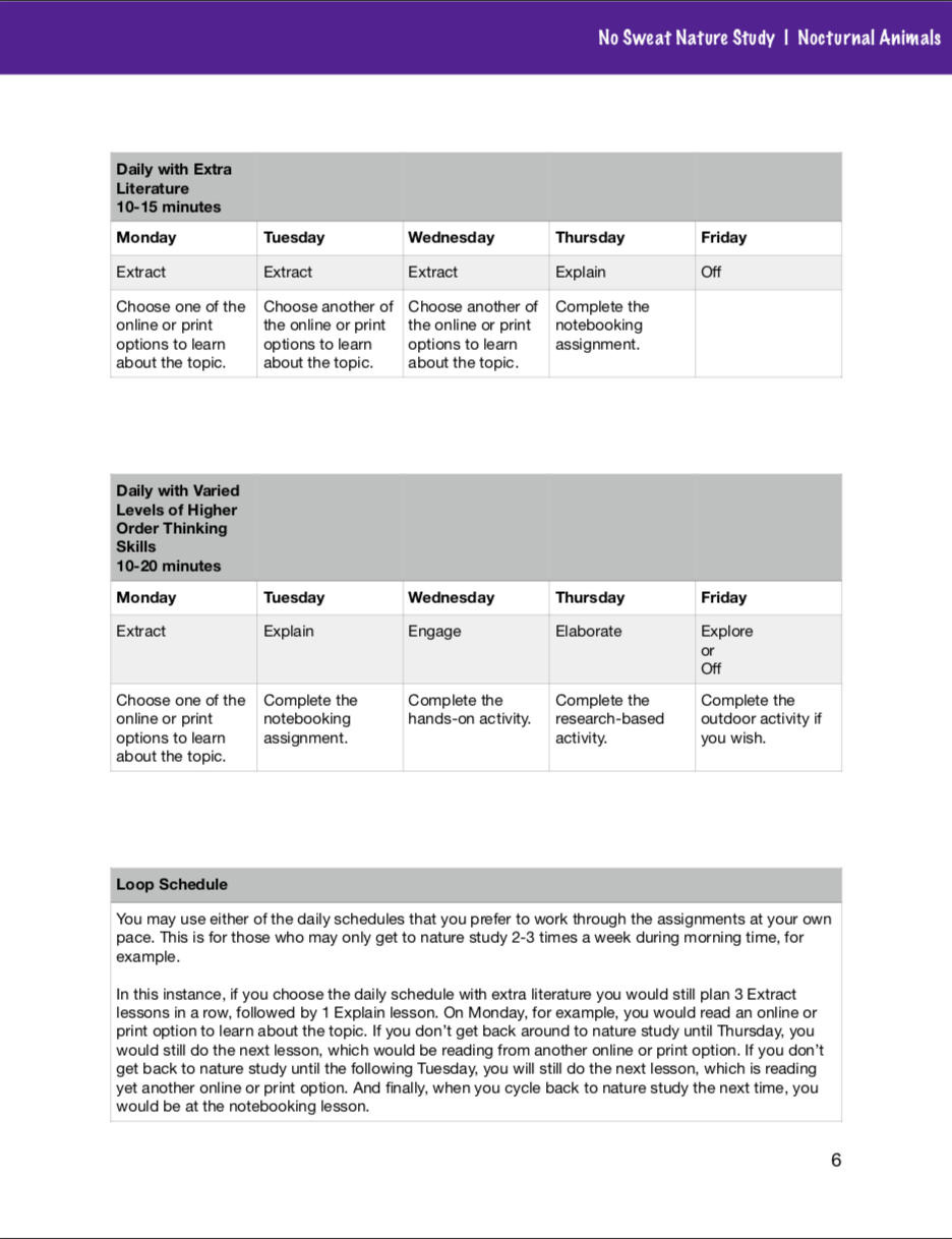 Each Nature Study Made Easy guide contains eight meaty lessons. Each lesson includes introductory material to read with the children. Follow-up learning for each lesson is based on the five “E”s – Extract, Explain, Engage, Elaborate, and Explore.