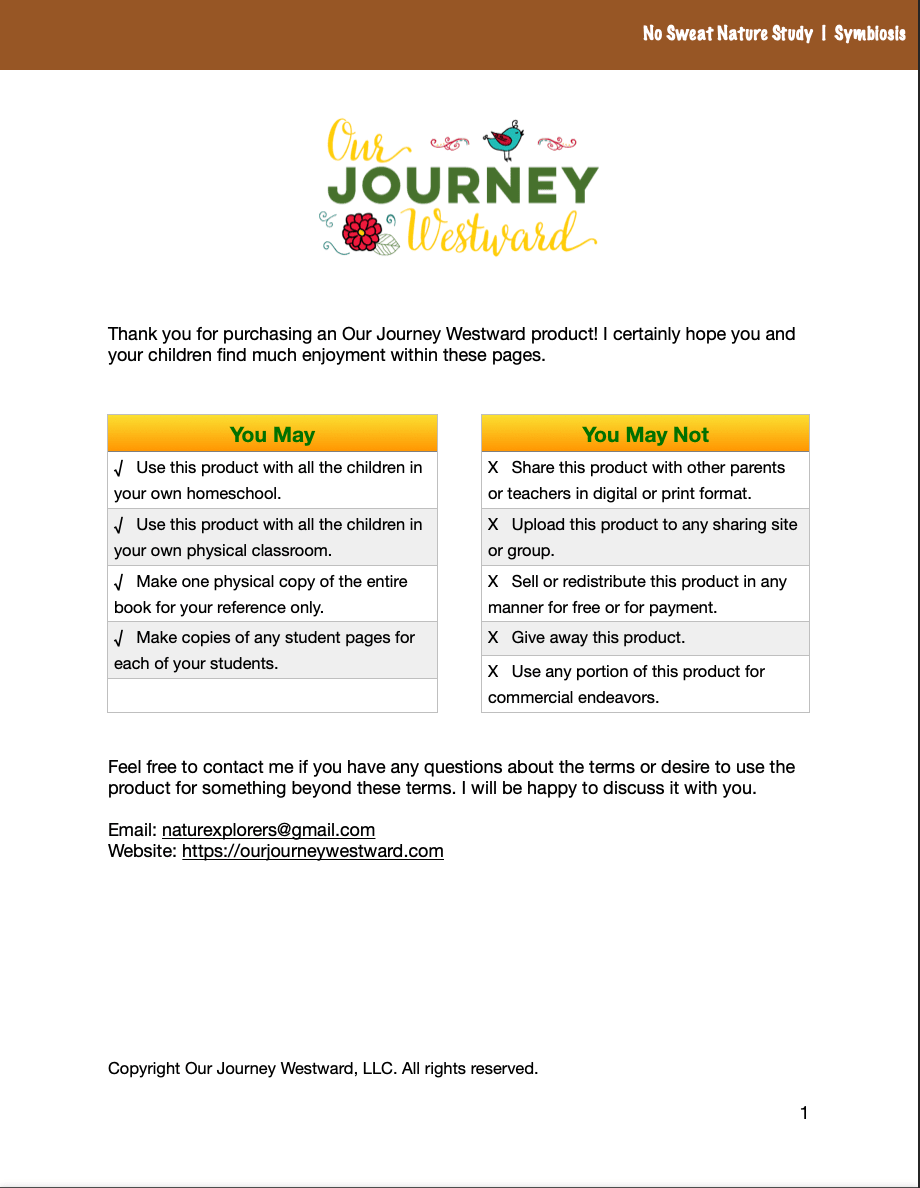 Some folks enjoy creating additional notebook pages, worksheets, charts, etc., to accompany the NaturExplorers studies and other Our Journey Westward publications. The pages you create must only be used with your children and may NOT be sold for profit or shared with others (online or otherwise) as free enhancements, go-alongs, or otherwise.