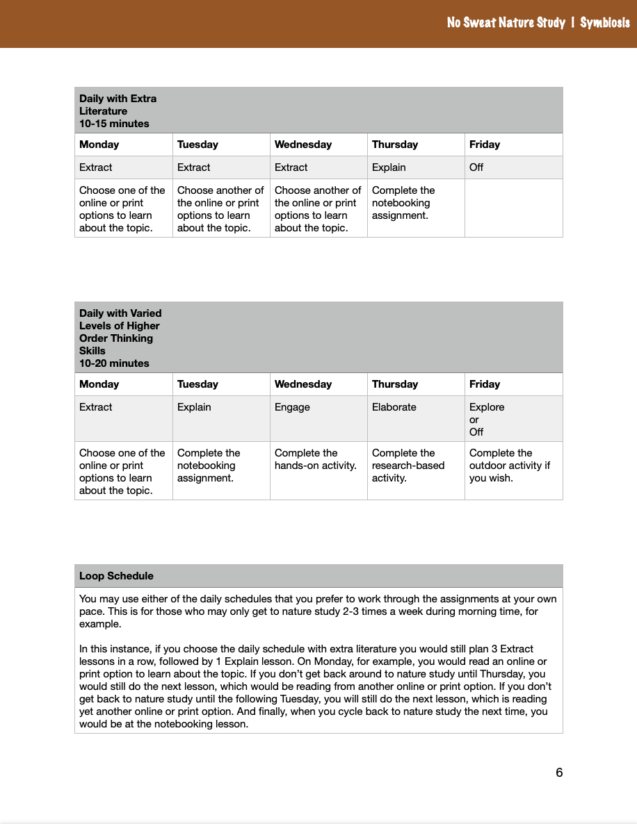 Each Nature Study Made Easy guide contains eight meaty lessons. Each lesson includes introductory material to read with the children. Follow-up learning for each lesson is based on the five “E”s – Extract, Explain, Engage, Elaborate, and Explore.