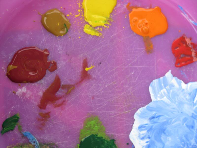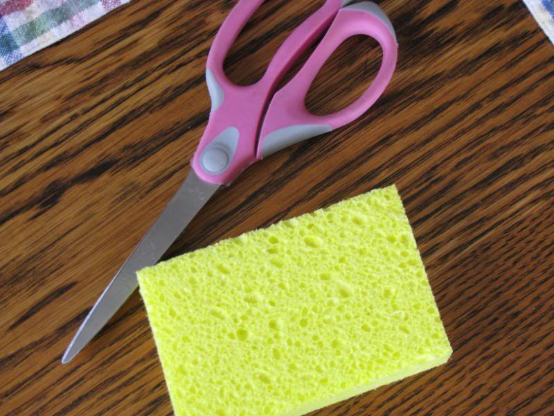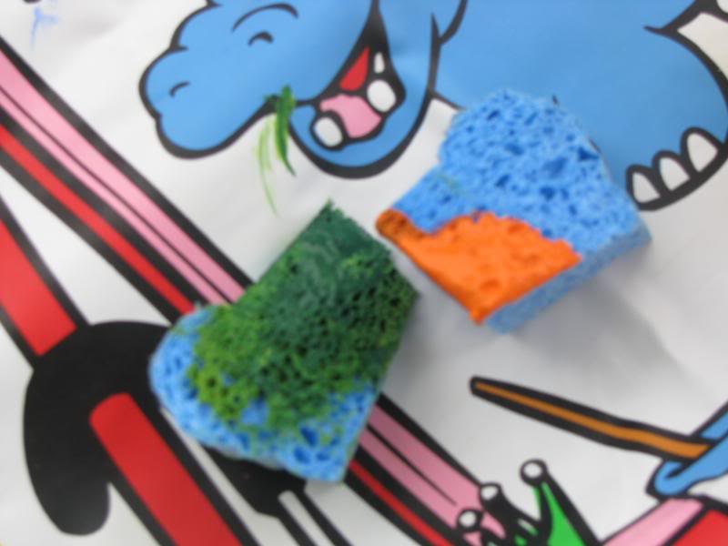 To record nature study today, we created sponge painted treescapes (a very easy and fun activity.) Take a cheap sponge (I found a bag full of 15-20 sponges at the Dollar Tree the other day) and let your child cut it into various odd shaped pieces. You’ll need a little piece per paint color. Squirt several fall colored tempera or acrylic paints onto a “pallet”.