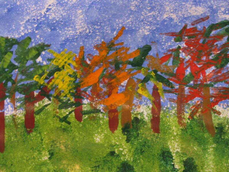 We started by using a few different blues and a white paint to make the sky. Then we moved on to the ground by using a couple of greens and a gold. Using a thin paintbrush and a couple different colors of brown, we just went along the ground/sky line painting in several tree trunks. Then using reds, yellow, orange and the green paints, we dabbed the edges of the sponges into the colors and gently dabbed onto the paper to create leaves. My explanation probably makes this sound harder than it was! At any rate, the finished product was lovely.