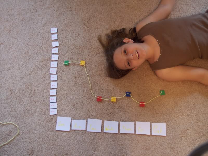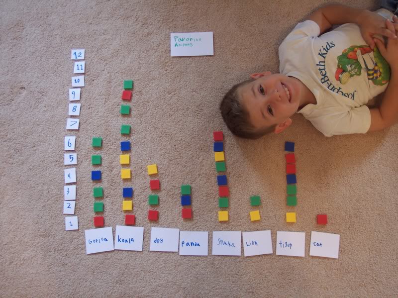 Next, he wrote each animal’s name on a notecard and placed the cards along the floor.  He knew he needed numbers going up the side  to show how many people liked each animal.  He used 1″ tiles to show the results from the 40 people he interviewed.  And finally, he wrote a title card calling his graph, “Favorite Animals”.  🙂