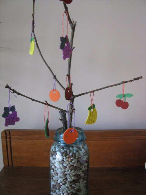 For very young children, I don’t write anything on the fruits. I let the child hang any fruit of his choosing, and we discussed the appropriate virtue.