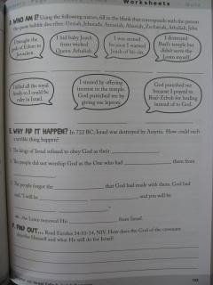- After reading through the lesson and the things mentioned in the bullet above, 2-4 worksheets follow that help your child review the material learned. From the Bible reference and the key facts/vocabulary page, several small sections of questions and fun games are derived. Your child will complete fill-in-the-blank activities, matching, multiple choice, mazes and word games. The worksheets always end with a short activity for your child to look up additional verses in the Bible that relate somehow to the Bible lesson.