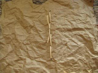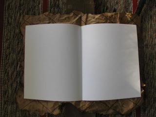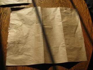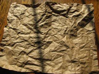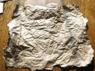 Take a flat section of brown paper bag and crinkle it up until it looks like worn leather when smoothed out again.