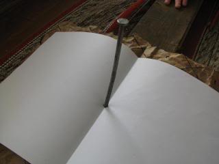 Lay the papers on top of a piece of wood. Hammer several holes all the way through the papers using a large nail and a hammer.