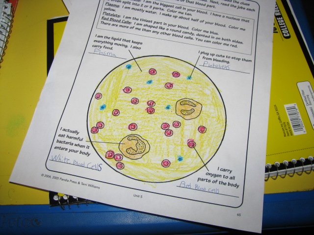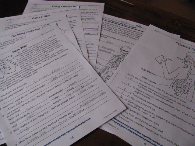 I don’t often give tests, but I have to keep Caleb on his toes, so a test fit the bill after this unit. It was actually quite simple to put together. I just took a ton of workbook pages from The Human Body by Frank Schaffer, stapled them together, gave him a due date and slapped a grade on the packet.