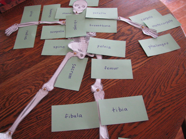Skeletal System – A large skeleton put together with brads helped Caleb practice matching bones to their names.