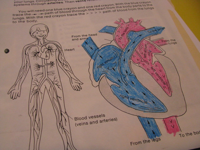 Circulatory System – A colored chart of the heart reinforced how oxygenated blood comes from the lungs and is pumped into the arteries from the left side of the heart, and how blood carrying carbon dioxide and other wastes comes in from the veins and is pumped into the lungs in the right side of the heart.