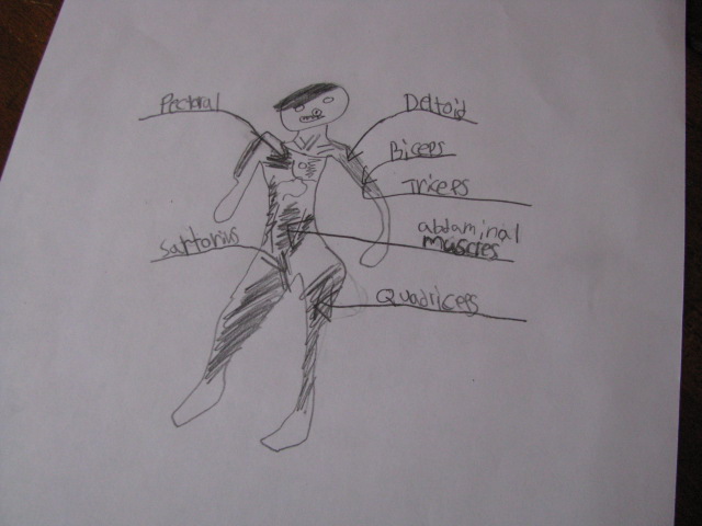 Muscular System – Well, the plan was to have a magnificent drawing of the major muscles. This is what I got. Ahem, someone was in a hurry to get outside to enjoy the unusually wonderful March temperatures. At least he can name the muscles, right?