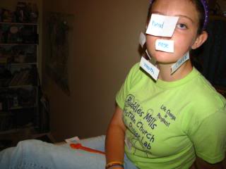 Mahayla is a super preschool teacher! She came up with the idea to make little cards with body parts written on them. She would read the body part and ask Eli to tape the card to the right spot on her! LOL He LOVED it!