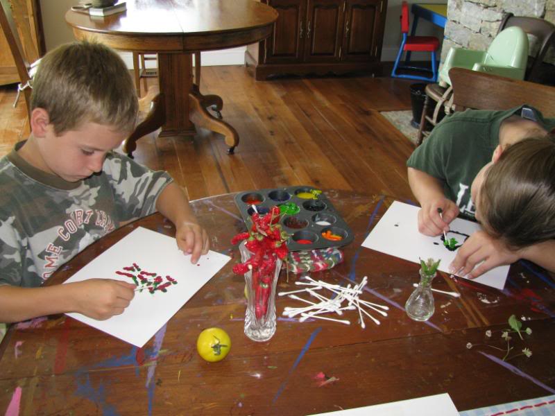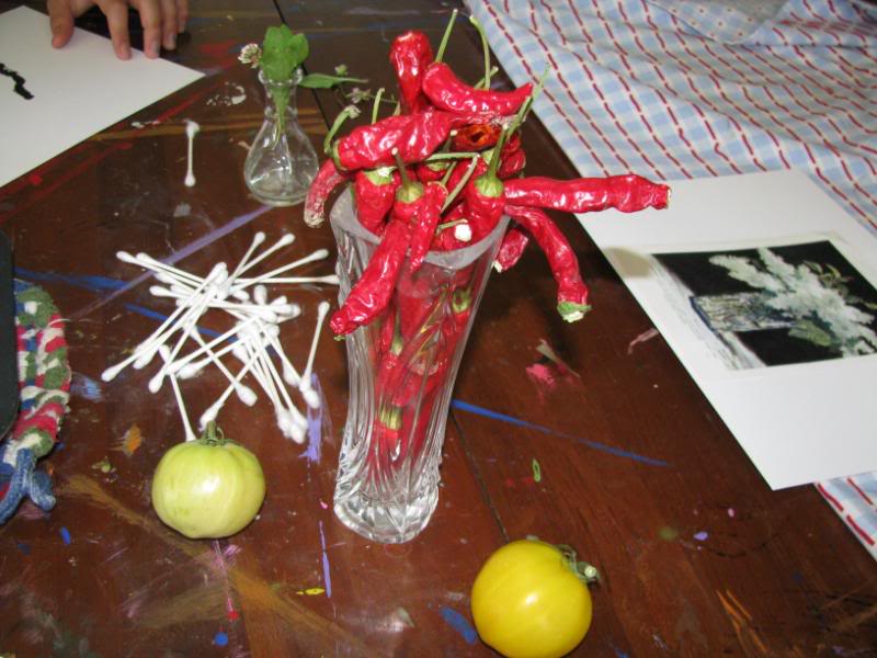 Caleb chose to do a still-life of red hot peppers in a vase, while Mahayla found some clover in the yard.