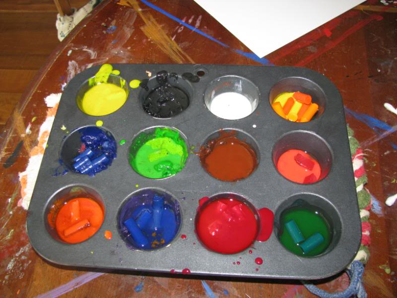 They had fun, but we had to continually stop painting to re-warm the crayons in the oven since we don’t own a warming tray. (Don’t use a good muffin tin – it will never be the same again!)