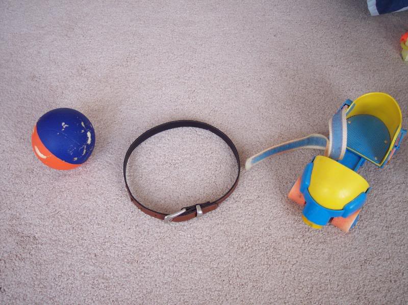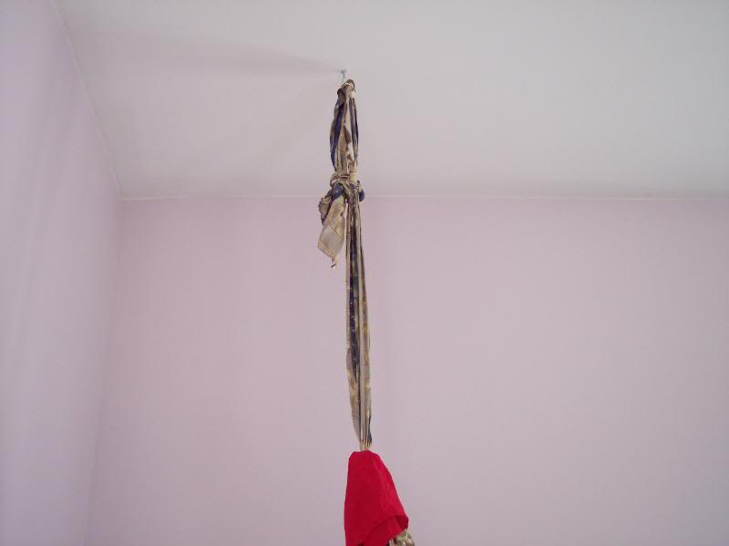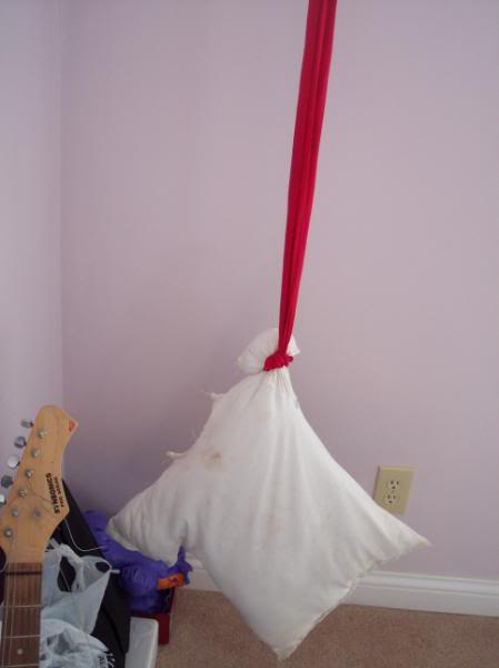 Have I ever mentioned his homemade punching bag? This room used to be his sister’s (hence the purple walls that we keep promising to paint!!) There’s a hook in the ceiling from a canopy that used to hang over his sister’s bed. Well, one day I see him standing on top of three big Rubbermaid tubs that he’s stacked. On tiptoes, with boxes wobbling below, he’s hanging this contraption!