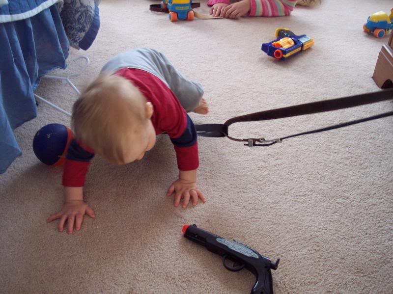 The belt and hanger system doesn’t seem to be stopping baby brother!