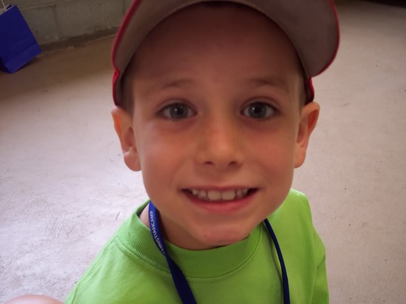 This is how he looked as I dropped him off Monday. See those nervous eyes? Yes, I cried. Not in front of him, though. He was being brave, so I needed to. Right before I left, I introduced him to two little boys who were playing the ring toss. Apparently, that was a good introduction because the camper group picture shows the three of them all chummed up together!