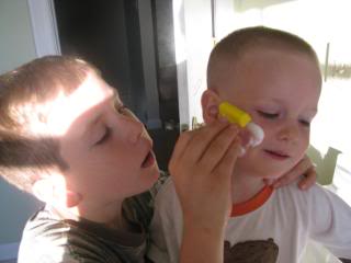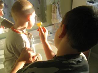 That same morning, my nine year old decided the two year old needed a quick shave.  The pictures were priceless!