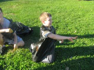 One team had a bowl/bucket of mustard. The other team had ketchup. Marshmallows were just scattered on the ground next to the bowl/bucket. Each team member dipped as many marshmallows into their bowl/bucket as they could hold at one time. When they were out of ammunition, they had to race back to their bucket for more. At the end of each game (they played this over and over!!), they gathered ammunition from the playing field for reuse. I can’t tell you how much fun they had! Of course, the trash bags didn’t save every surface from staining. Those clothes are ruined forever. Luckily, the coordinator warned us ahead of time. Oh, and she also brought tons of wipes for clean-up afterward because our shelter area didn’t have water available.