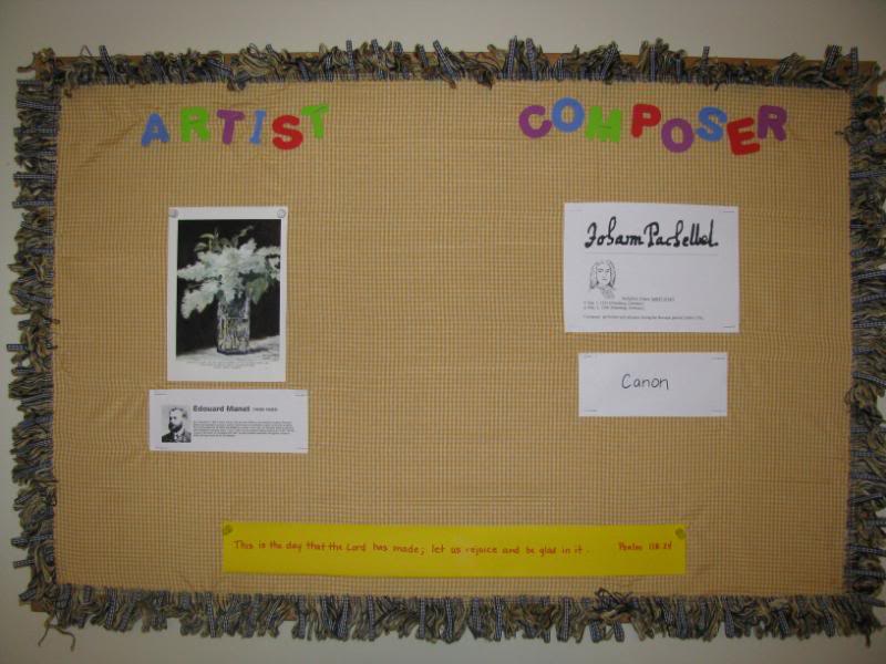 As another addition to our more purposeful artist and composer study, Candace gave me the idea for a bulletin board in the schoolroom. Here’s the finished board with our first artist (Manet) and composer (Pachelbel) ready and waiting. At the bottom of the board I have placed a memory verse. As the artist and composers change, so will the memory verse.