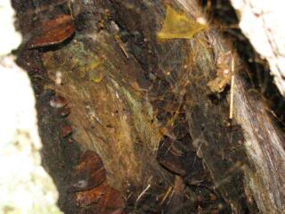 Can you see the hollow of this tree filled with wispy orange webs?