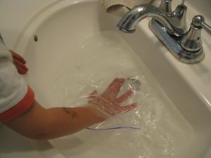 After reading about ducks, we made our own webbed feet with baggies and paddled through the sink.