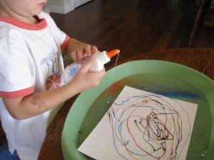 After reading a book about deserts, I let him swirl glue all over cardstock and we added colored sand to make a desert picture.