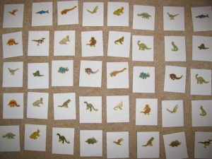 A homemade dinosaur memory game is easy to make with dinosaur stickers and index cards.
