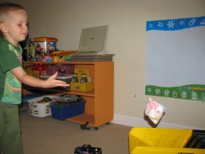 Tossing bean bags into a dump truck was a great large motor skill activity.