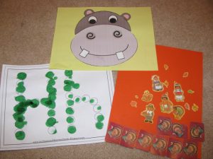 We made upper and lower case H’s using a bingo marker and a hippo puzzle, again from Confessions of a Homeschooler.  I had some holiday stickers that he had fun crafting with, too.