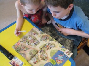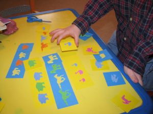 These pattern puzzles were made with foam animal stickers and cardstock.  One long  piece of cardstock holds four stickers of the pattern, another smaller piece of cardstock holds two more stickers in the pattern.  Your little one matches the pattern cards.