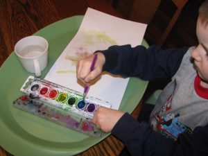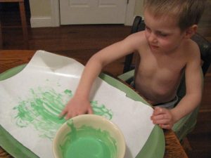 More painting!  Equal parts flour and water + a little food coloring made a very simple finger paint. Freezer paper is perfect for finger painting.