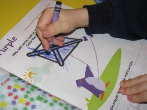 Eli completed some purple pages in his Dollar Tree workbooks.
