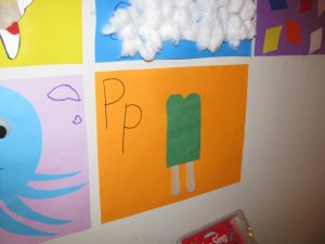 A popsicle made from construction paper and popsicle sticks hangs on our alphabet wall.
