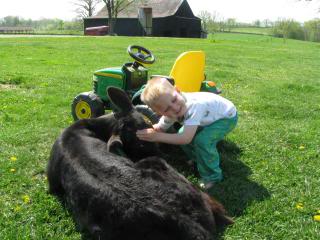 You may remember me telling you about our bottle fed calf that was truly a giant baby when he was born.  Well, not only is he still a literal big baby, he’s a figurative big baby as well!  I’ve never seen a calf take to my children like this one.  He follows them around the yard, sits on my porch (!!) and generally just hangs out like any normal pet.