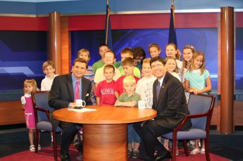 What fun we had visiting WKYT TV in Lexington today!  They took us on a tour of the newsroom, video control room for broadcasts, video control room for taping shows, and the live set.  The kids all had the chance to stand in front of the green screen to try their hand at pointing correctly on the weather map.  It was hard!  Anchorman Bill Bryant was interviewing the Lexington mayor and they ageed to a picture with our group.  (Thanks for the picture, Tracie!)